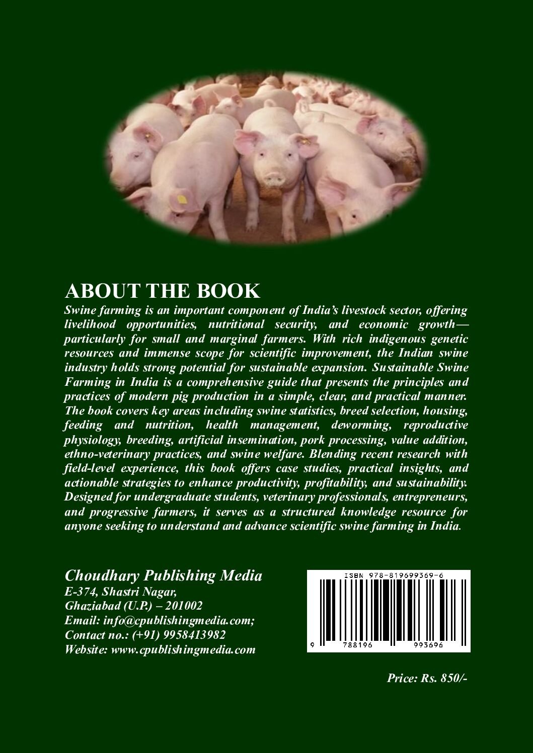 Swine farming is a crucial aspect of the global food industry, providing a significant source of protein worldwide. It has been a part of human civilization for thousands of years, with evidence of pig domestication dating back to around 7,000 BC. Despite its long history, pig farming has continued to evolve over the years, with new technologies, management practices, and breeding techniques emerging to improve productivity and sustainability. India is basically a rural oriented and agriculture-based country with around 70% rural population. Livestock sector is a vital source of economic assistance to agriculture and greatly contributes to national income. Today, pig farming is a complex and multifaceted industry, with a range of production systems, breeds, and management practices that farmers can adopt. It also plays a significant role in the global economy, with pork being the most widely consumed meat in the world. As such, it is essential to understand the intricacies of pig farming, its challenges, and the best practices that can ensure its sustainability. However, the commercial pig industry in India provides economic opportunities for farmers, entrepreneurs, and rural communities. It creates employment in various stages of the value chain, including rearing, processing, and marketing of pork products. As the country has tremendous potentiality of improvement of pig production through scientific management coupled with adoption of advanced technologies can improve productivity, feed efficiency, and disease management, making pig farming more profitable and sustainable. As per the 20th livestock census pig population in India was 9.06 million in 2019, Swine sector showed a decrease of 12.03 % population over 19th livestock census of 2012. India is bestowed with 15 indigenous (Registered) swine breeds, around 79% being indigenous or non-descript and nearly 50% of pigs are spread in North-eastern states, with Assam, Jharkhand and Meghalaya holding significant, increasing population. These breeds are recognized for their unique characteristics.This book “Sustainable Swine Farming in India” includes 29 chapters and provides a comprehensive information to pig farming, covering various aspects such as Statistic of swine, breed selection, genetic resources, housing and infrastructure, feeding and nutrition, deworming, common swine diseases, health management, reproductive physiology, reproduction, breeding, artificial insemination, and overall management practices. It also includes information on pork processing, value edition ethno-veterinary practices and swine welfare etc. Attempt has been made to complete this manuscript on Swine Farming in most simple, clear and talking language so that the contents could be easily followed by the readers, it is a step towards recent researches and advances in Sustainable swine farming. Moreover, the case studies, real-life examples, and useful tips from experienced pig farmers can provide valuable insights and practical knowledge. However, it’s important for pig farmers/ users to assess the suitability of different techniques based on their specific farming conditions, local regulations, and market demands.